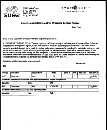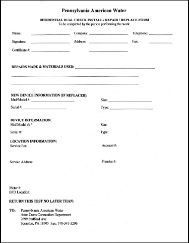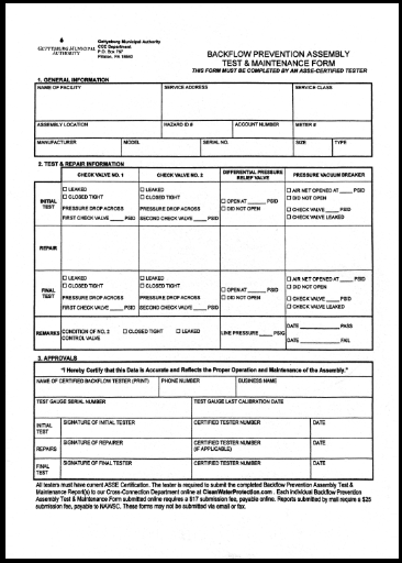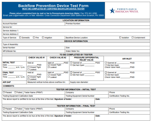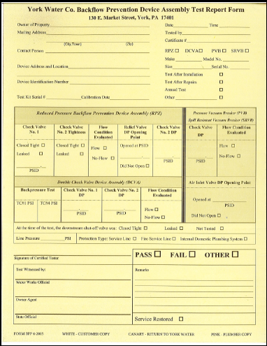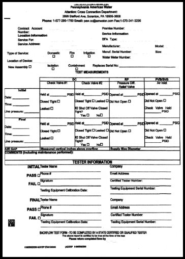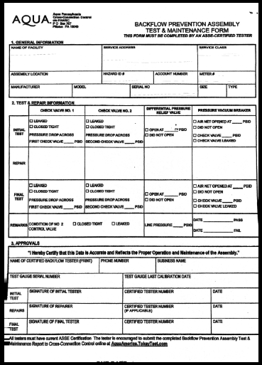 If you get any one of the forms shown below requiring to test for backflow integrity, you need to call us as soon as possible. The entity that is responsible for water quality in your area may require a backflow test.